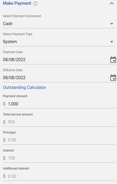 “Select Payment Instrument” - The user can select the instrument from the drop-down-by default it would be “Cash”