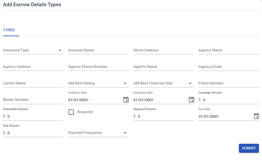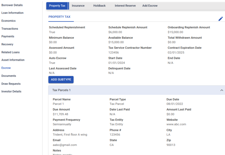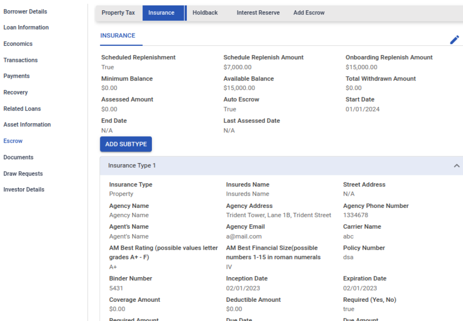 Types of Escrow Accounts - Property Tax, Insurance, and Holdbacks for CRE loans; Interest Reserve for Construction loans. Each escrow account can have sub-types as well.