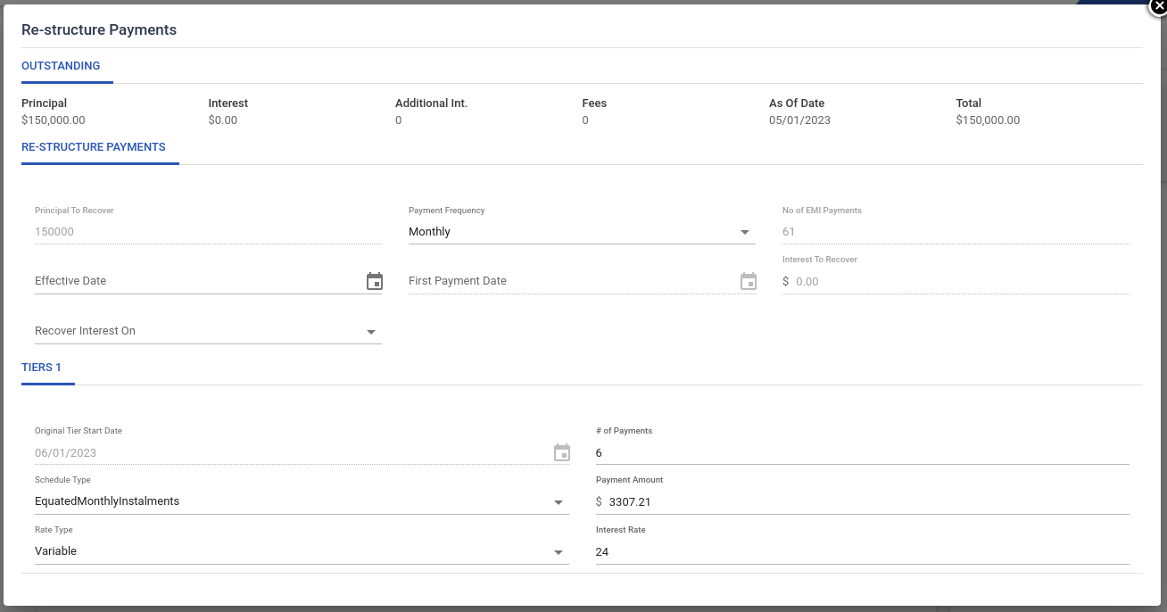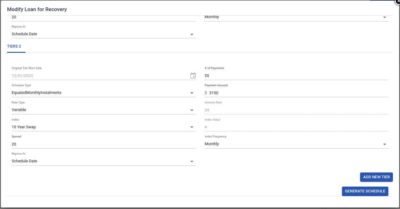 You can edit payment tier information, # of payments, Schedule Type, Payment Amount, Rate Type, and Interest Rate.