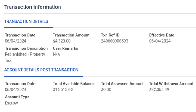 Manual Replenishment If the user wants to replenish the escrow manually, then he needs to first assess the amount using the “Assess Escrow” action and then apply the payment using the “Make Payment” action as shown below.