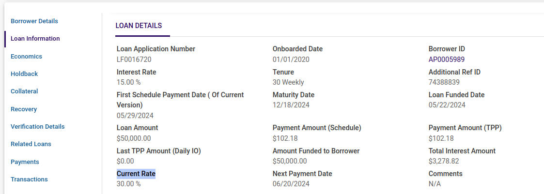 Also we have one field “Current Rate” in the Economics and Loan Details tab which shows the current interest rate for the loan. “Current Rate” field might be different from the original interest rate if the loan is in delinquent.