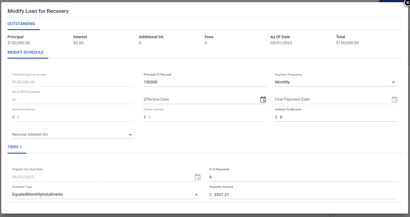 - If "Schedule Type" is Equated Monthly installment and the tier is the current tier then the "Schedule amount" field will be editable.