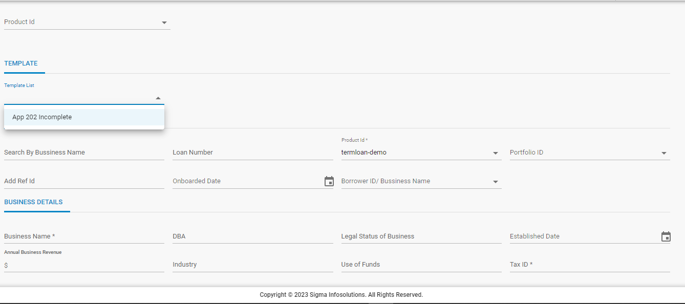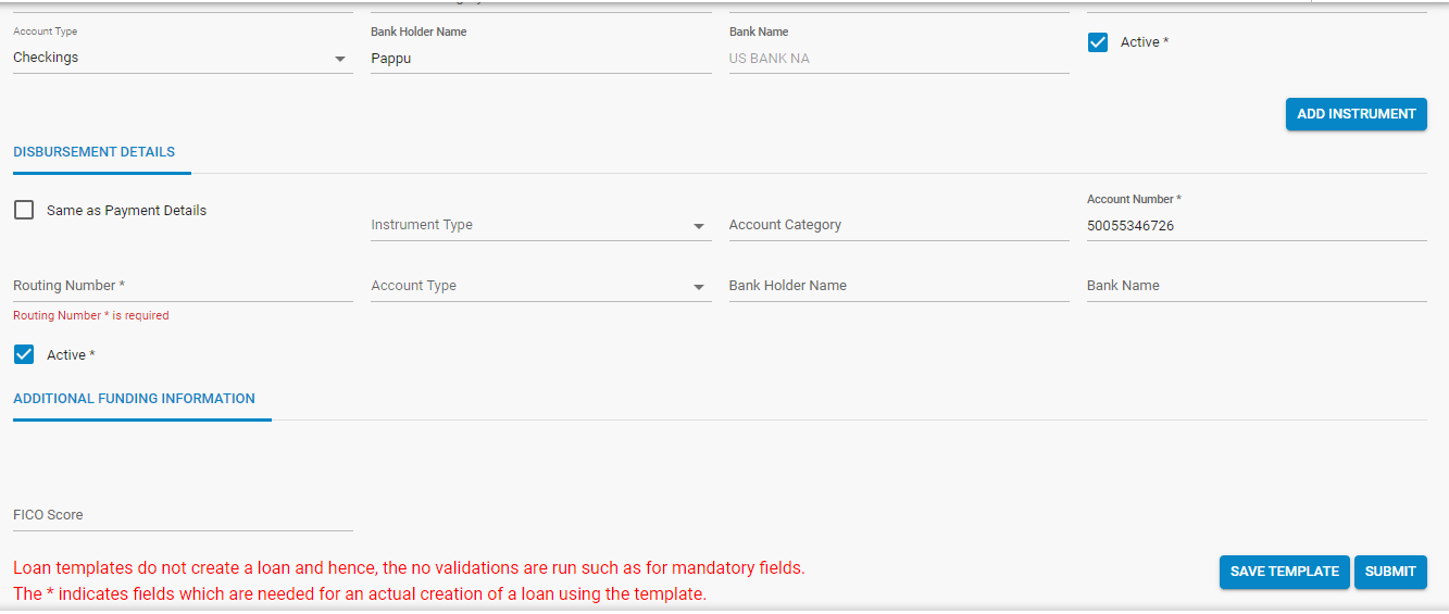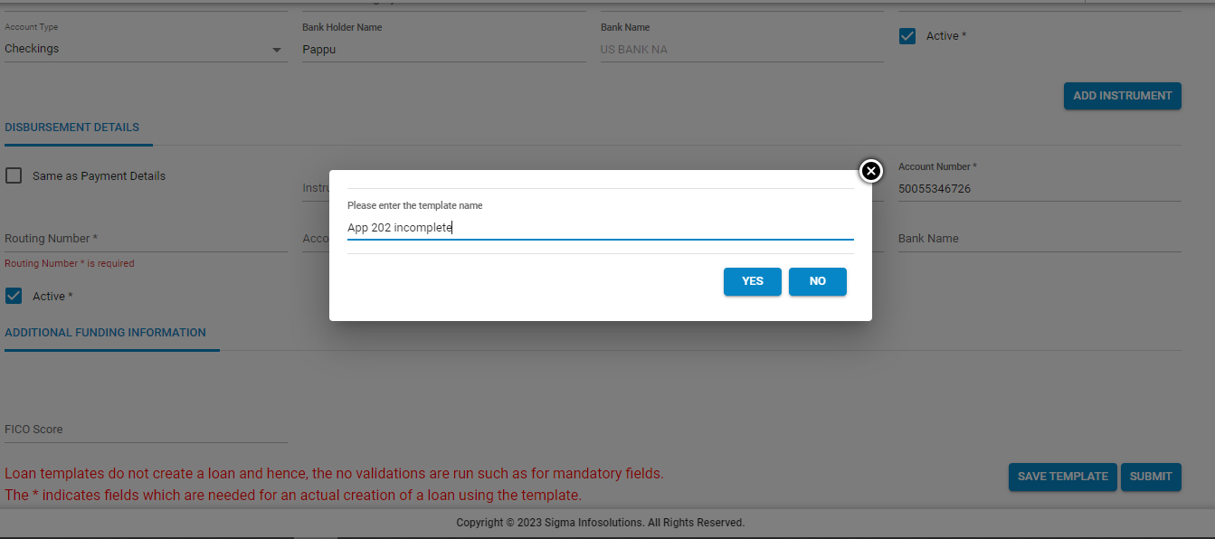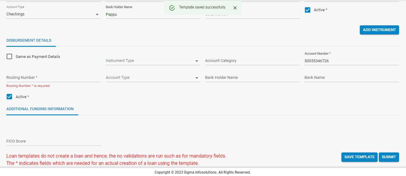 - Once details are filled out, at the bottom, 2 options are available, “Save Template” and “Submit”. If the “Submit” button is clicked, then a loan is onboarded and a success message will appear as shown below.