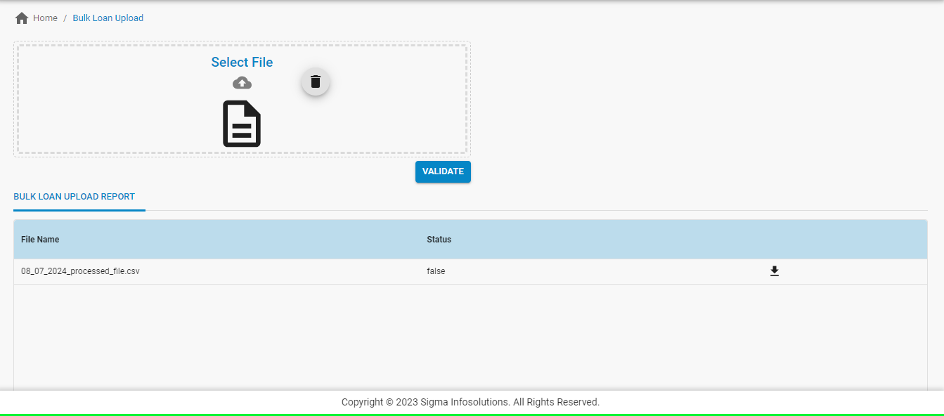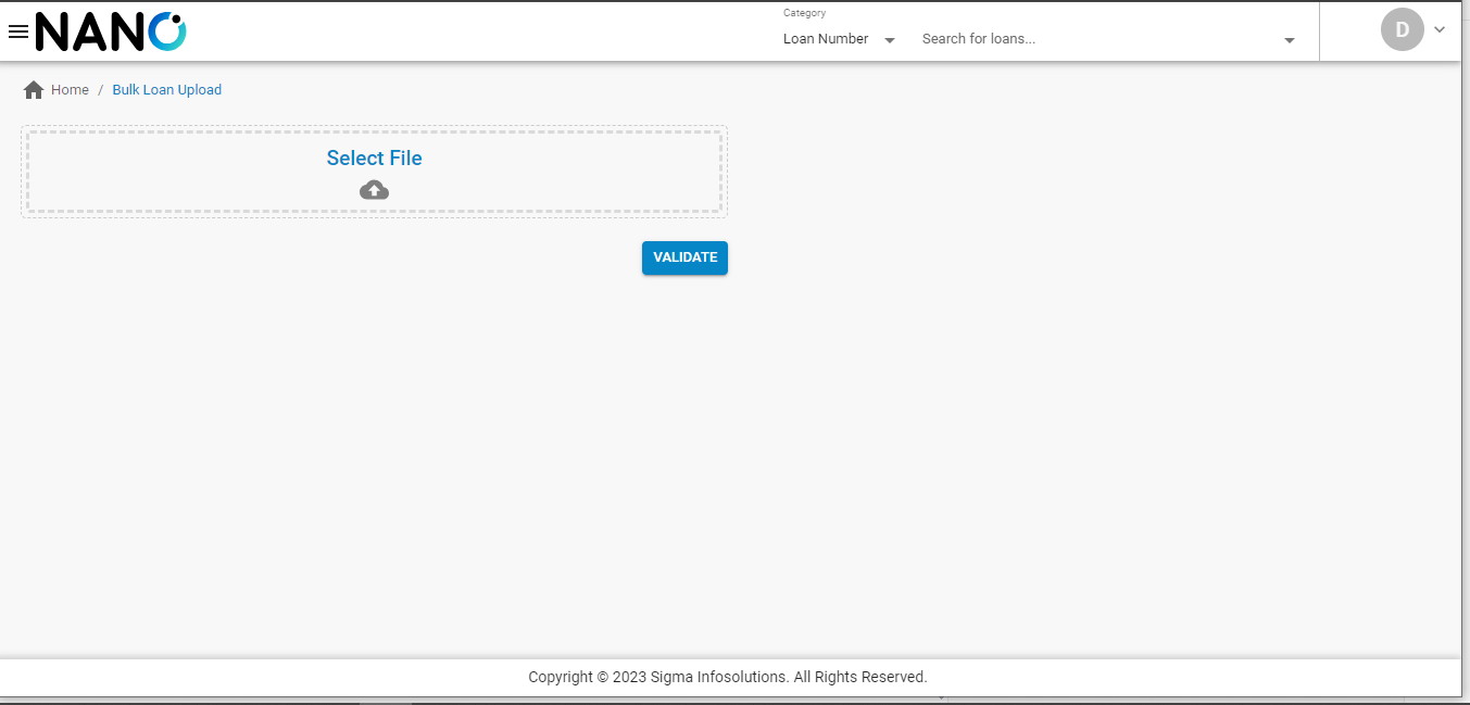 On selecting “Bulk Loan Upload”, the page is redirected to “Bulk Loan Upload”, which prompts for a file upload to be validated.