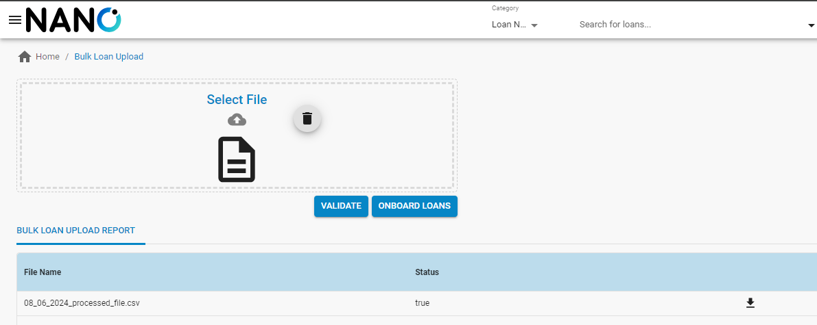 Once the file has been validated successfully, a new table labeled “Bulk Loan Upload Report” will appear as shown below, and the status column will have “true” as value. Also, there will be an option to "Onboard Loans". There will also be the ability to download and view the validated file. Note: A sample file will be shared with users off the platform