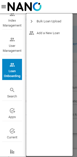 The left option menu expands to show two options, “Bulk Loan Upload” and “Add a New Loan”.