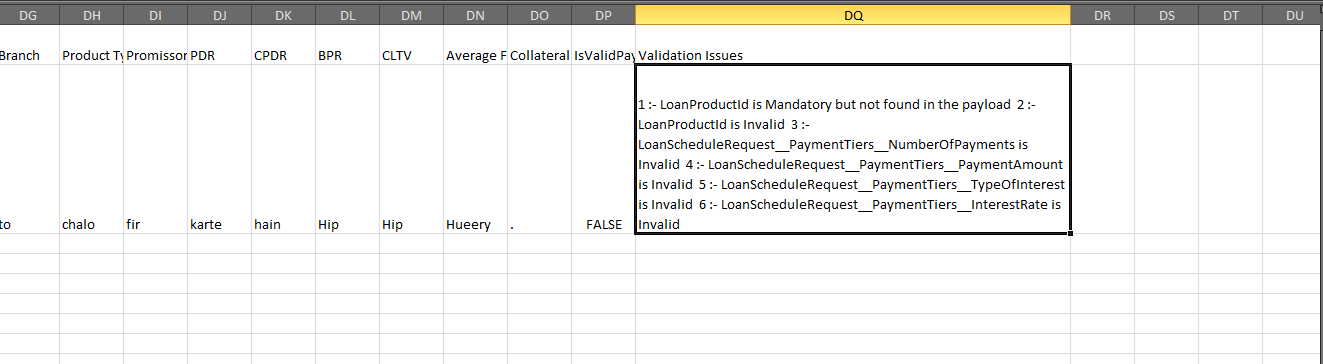 - However if the validation fails, the value in the status column will be false. The processed file can be downloaded and reviewed, with an error message at the last column.